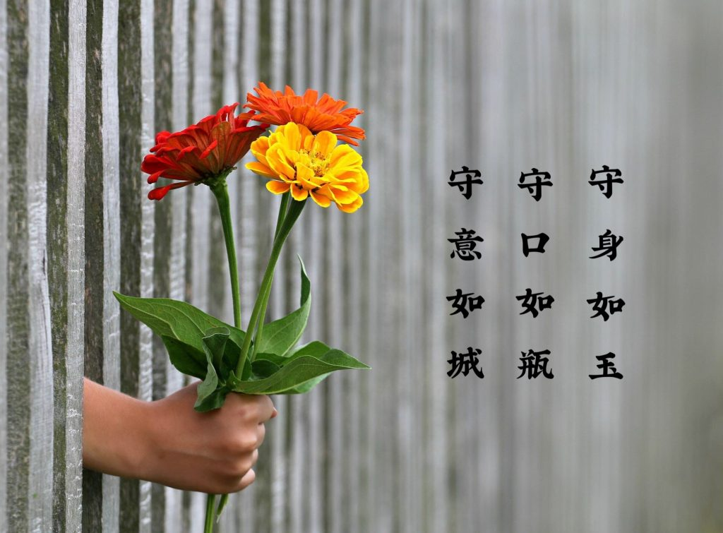 我们要“守身如玉”,不杀生、不偷盗、不邪淫;要“守口如瓶”,不妄语、不绮语、不两舌、不恶口;要“守意如城”,我们的贪嗔痴不要发出来。